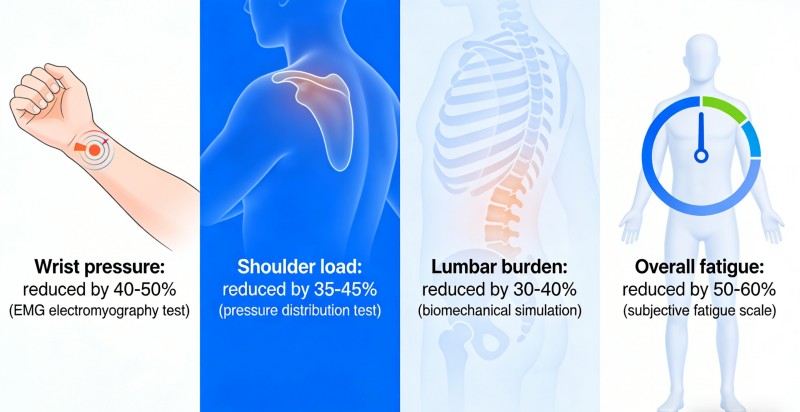 Снижение риска деформации Давление на запястье: Снижается на 40-50% (ЭМГ-электромиография). Нагрузка на плечи: Снижена на 35-45% (проверка распределения давления) Нагрузка на поясницу: Снижается на 30-40% (биомеханическое моделирование) Общая усталость: Снижается на 50-60% (субъективная шкала усталости)