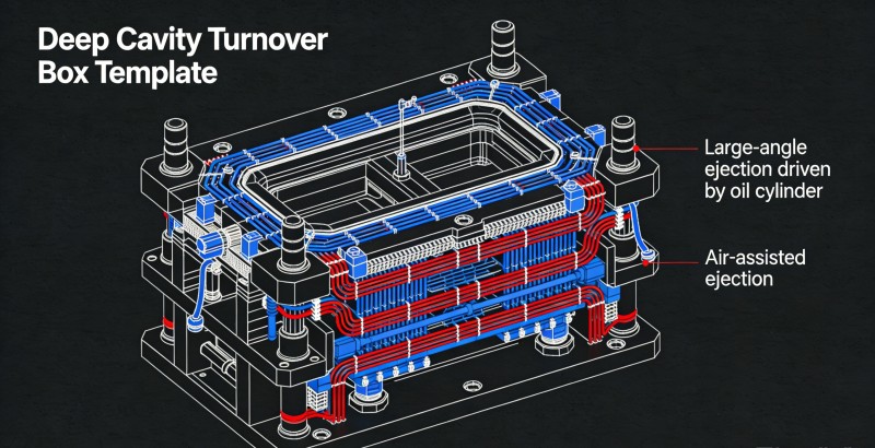 Проблема: Большой объем и толстые стенки логистических контейнеров приводят к увеличению времени охлаждения, что ограничивает производственные мощности. Решение: Спроектировать многослойные последовательные высокоскоростные каналы охлаждения, плотно охватывающие все толстостенные участки. Для контейнеров с глубокими полостями сочетайте «наклонные выталкиватели с большим углом наклона с гидравлическим приводом от цилиндра» с «выталкиванием с помощью газа», чтобы обеспечить плавное и быстрое извлечение из формы за минимальное время без деформации или вакуумного прилипания, сводя к минимуму производственные циклы.