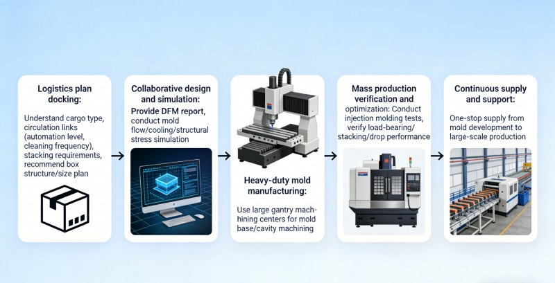 1. Согласование логистического решения. Изучите тип вашего груза, этапы обработки (например, уровень автоматизации, частоту очистки) и требования к штабелированию, чтобы рекомендовать оптимальные решения по структуре и размеру контейнера. 2. Совместное проектирование и моделирование. Предоставляйте подробные отчеты DFM и проводите моделирование течения, охлаждения и структурных напряжений в пресс-формах, чтобы обеспечить оптимальные решения для пресс-форм как с точки зрения производительности, так и с точки зрения стоимости. 3. Изготовление пресс-форм для тяжелых условий эксплуатации. Используйте большие портальные обрабатывающие центры, чтобы гарантировать точность и жесткость при обработке оснований и полостей больших форм. 4. Проверка и оптимизация массового производства. Проведение непрерывных производственных испытаний машин для литья под давлением для проверки критических показателей производительности (испытания на нагрузку, штабелирование, падение) и доработку процессов. 5. Непрерывные поставки и поддержка: мы предлагаем комплексные поставки от разработки пресс-форм до крупномасштабного производства литья под давлением, обеспечивая стабильное качество продукции и своевременную доставку.